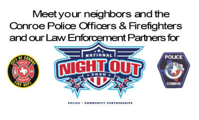 CONROE, TX – The Conroe Police Department is hosting a 2020 National Night Out at the Conroe Kroger Shopping Center, located at 341 S. Loop 336 in Conroe, from 5:00 – 8:00 p.m. The event is designed for residents to meet their neighbors, the Conroe Police officers and firefighters, and law enforcement partners in a relaxed, informal setting under positive circumstances.