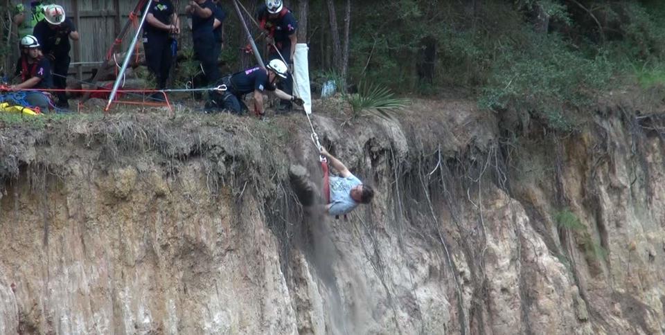 CONROE, Texas – A 63-year-old man and his dog fell Sunday morning into a 50-foot ravine in Conroe, officials said. The Needham Fire Department responded after 10 a.m. to Lake Drive in the Lake Creek Forest subdivision, where they found Chad McManus at the bottom of the ravine which borders his property.