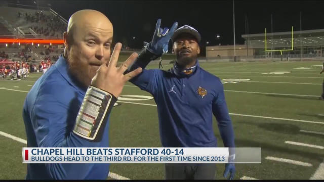 NEW CANEY, Texas (KETK) — One week ago, the Chapel Hill Bulldogs traveled to New Caney, and knocked off Livingston in a back-and-forth shootout, but on Saturday they left no doubt in the are round. Jeff Riordan and the Bulldogs left Randall Reed Stadium, beating Stafford 40-14, and advancing to…