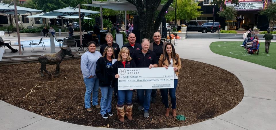 THE WOODLANDS, TX – As part of its Change for Charity initiative, Market Street recently donated nearly $11,000 to God’s Garage. The funds were raised by Market Street patrons and The Woodlands Car Club event attendees during the third quarter of 2020 and will assist the organization, which is a garage that repairs vehicles for single mothers, widows and wives of deployed military.