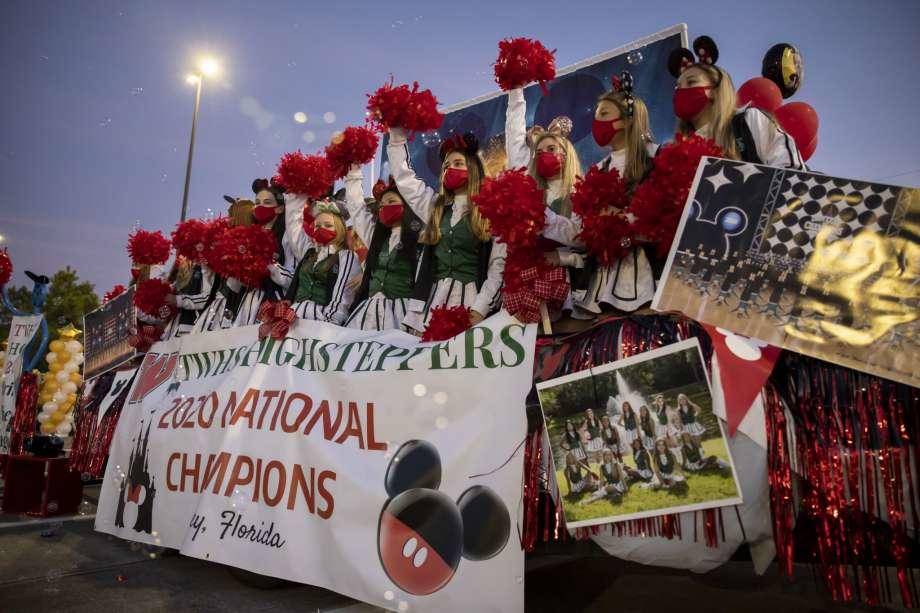The Woodlands High School Highsteppers wave at passing crowds of families during the annual Red and Green parade and pep rally outside Woodforest Bank Stadium in Shenandoah, Wednesday, Nov. 14, 2020. A variety.