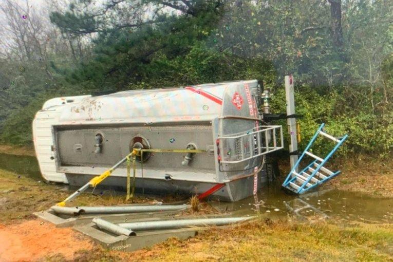 A tanker loaded with Jet fuel rolled over in the ditch on Hawthorne Drive at the Conroe Airport. The driver told police his brakes failed when it occurred. Several hundred gallons have leaked into the ditches. Conroe Fire is on the scene. HAZMAT International has been tasked with the recovery and clean-up. Hawthorne Drive will be closed for the next several hours. The driver was not injured.