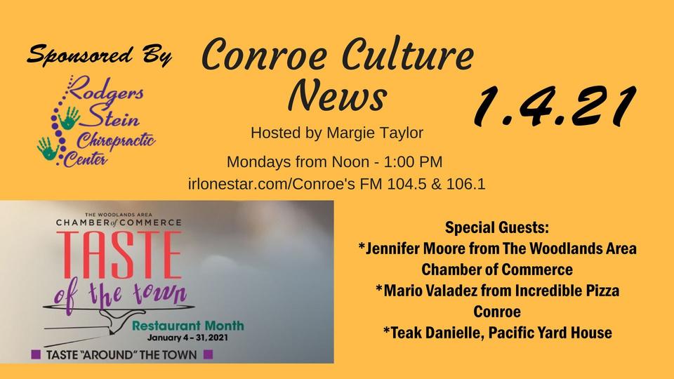 1.4.21 – Taste of the Town – Conroe Culture News. For over 30 years, Taste of the Town has been the ultimate foodie experience. In 2021 guests will go to participating restaurants to experience the ambiance of each location. Guests:. *Jennifer Moore from The Woodlands Area Chamber of Commerce. *JJ…