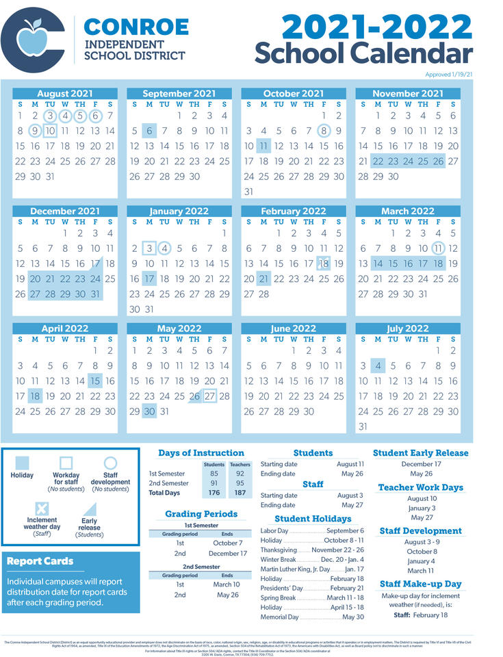 CONROE, TX – At their meeting Tuesday night, the Board of Trustees adopted the 2021-2022 School Calendar as recommended by the CISD District-Level Planning and Decision-Making Committee (DLPDMC). The 2021-2022 calendar reflects 176 days of instruction and a minimum of 75,600 instructional minutes for students and 187 working days for…