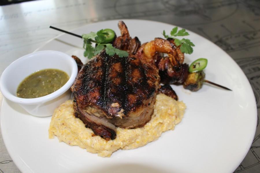 The bacon-wrapped center-cut ribeye, a special item not on the menu, ($28) is served on a bed of artismal grits and Brussels sprouts with fresh shrimp kabobs. (Eva Vigh/Community Impact Newspaper) Now is the chance to help your local community succeed. Become a Patron by contributing to Community Impact Newspaper…