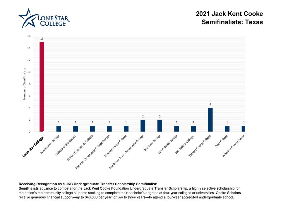 The Jack Kent Cooke Foundation announced 15 Lone Star College students were recognized as semifinalists for its highly competitive Cooke Undergraduate Transfer Scholarship. “Lone Star College had far and away more semifinalists named than any other college in Texas,” said Stephen C. Head, Ph.D., LSC chancellor. “This level of achievement is not only a testament to our students, but also to our faculty and staff who are helping prepare these remarkable scholars.”