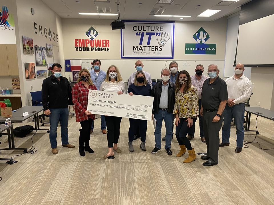THE WOODLANDS, TX – As part of its Change for Charity initiative, Market Street recently donated nearly $11,000 to Inspiration Ranch. The funds were raised by Market Street patrons and The Woodlands Car Club event attendees during the fourth quarter of 2020 and will assist the organization, which serves special needs clients and trauma victims.