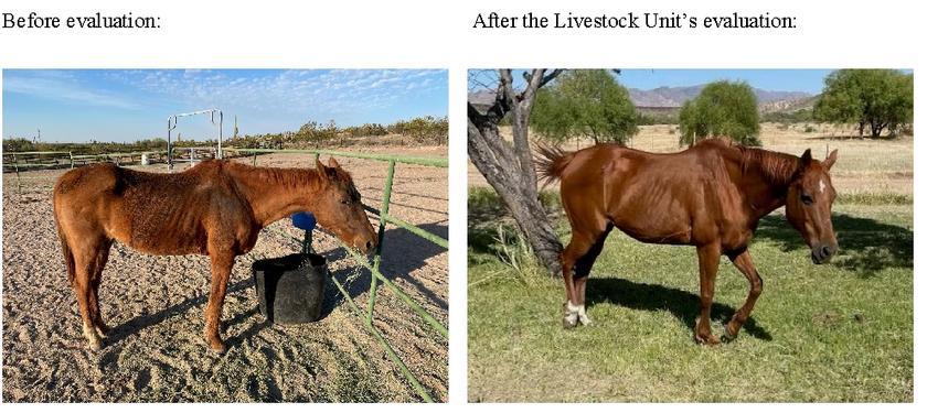 MONTGOMERY COUNTY, TX — The Montgomery County Sheriff’s Office Livestock Unit is pleased to offer a new public service to the horse owners of Montgomery County!. We understand horses are very important family companions, and protecting their health is incredibly important. If you notice your horse has lost weight or its behavior has changed, please call us at 936-760-5800. We are fortunate to have the training and experience as well as the resources to come out and evaluate your horse, the feeding regiment, and your property. This service will assist you with formulating a plan to help you maintain the health of your horse. Featured below is a transforming example of our services: