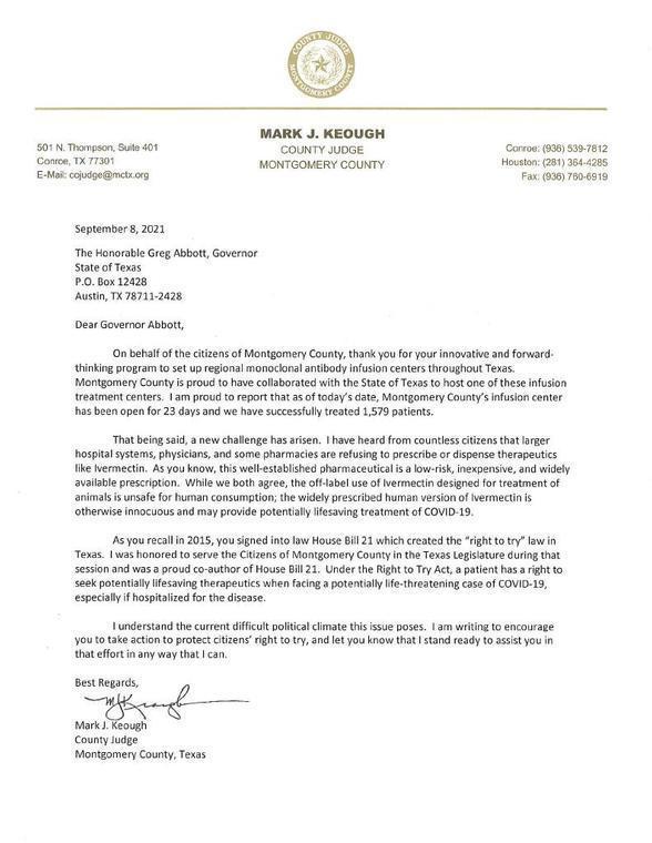 THE WOODLANDS, TX — Montgomery County Judge Mark J Keough posted the following to his Facebook page today:. ‘Today I sent Governor Abbott a letter urging him to consider taking action to ensure the Texas Right to Try Act was being followed when patients seek potentially lifesaving treatments that are considered investigational while not FDA approved. The Texas Right to Try Act was passed into law in 2015 and I was a proud co-author of this bill when I served in the Legislature. Doctors hands should not be tied when their patients or family members are seeking treatment in terminal cases of COVID-19 and the Texas Right to Try Act protects those rights.’