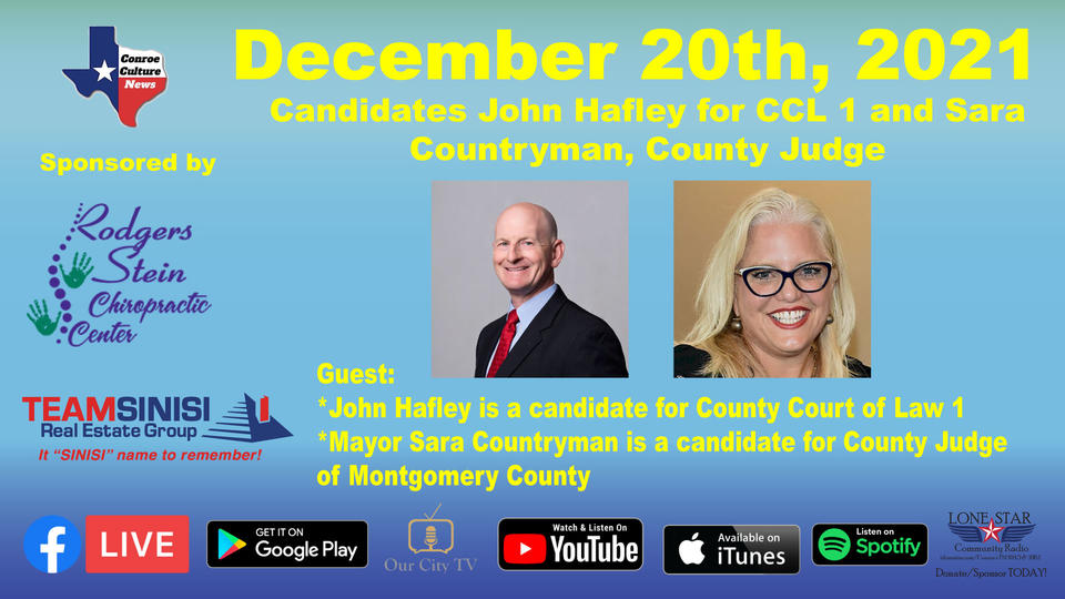 12.20.21 – Candidates John Hafley for CCL 1 and Sara Countryman, County Judge – Conroe Culture News with Margie Taylor. Mayor Sara Countryman is a candidate for County Judge of Montgomery County. —– Check out past shows:https://irlonestar.com/conroeculture. Contact Margie: margie@taylorizedpr.com. —- This show is owned and produced by…