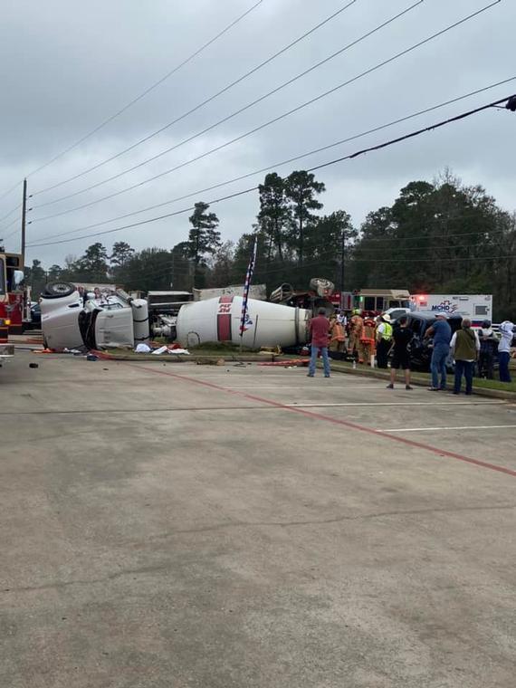 MAGNOLIA, TX — Just after 9am this morning The Woodlands Fire Department’s Rescue and Hazmat teams responded to the 9300 Block of FM 1488 to assist Montgomery County ESD No. 10/ Magnolia Fire Department and Montgomery County Hospital District with a vehicle accident with two people trapped. A cement truck had overturned on top of a passenger car trapping both the truck driver and the driver of the car. Firefighters were able to extricate the truck driver relatively quickly but it took almost an hour to free the person trapped in the car. Amazingly both patients had, for the most part, minor injuries and both were transported to the hospital by MCHD for further evaluation. Expect traffic to be backed up for another few hours until the wreck can be cleared.