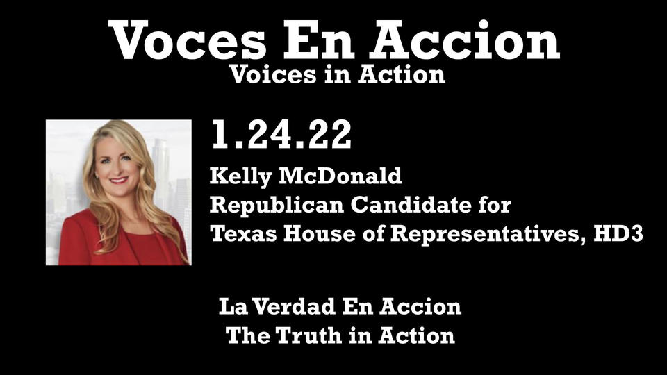 Premier of Voces En Accion/Voices In Action, a non-profit educational show created for the Hispanic community, located in Montgomery County in Texas. Mrs. Kelly McDonald, candidate for the House Representative District #3 position. Premier de Voces En Accion/Voices In Action, un programa educacional sin fines de lucro, creado para la…