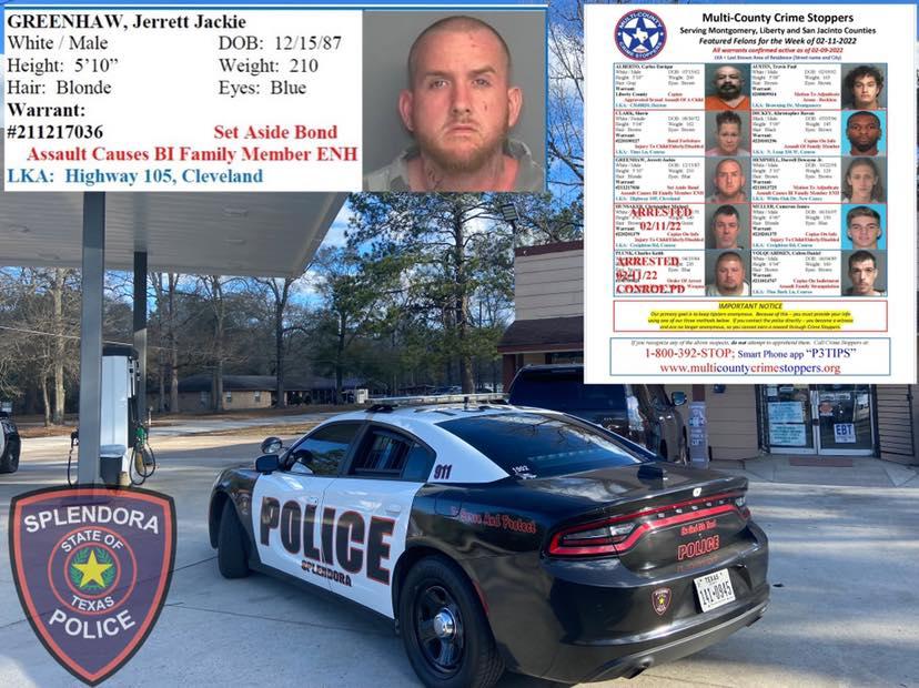 MONTGOMERY COUNTY, TX — Officer with Splendora Police Department observed a male who the officer recognized as a wanted individual, later identified as Jarret Greenhaw sitting outside a local business. The officer went to go make contact with Jarret, when Jarret turned away from the officer. The officer went to detain Jarret. At this time, Jarret began to resist the officer. A couple of outstanding citizens saw the officer attempting to detain Jarret, when they jumped into action and assisted the officer. Jarret was shortly detained. After further investigation, Jarret was found to be in possession of a Controlled Substance. Jarret also showed to have an outstanding warrant for Assault Family Violence causing Bodily Injury. Jarret was arrested for the warrant along being charged Possession of Controlled Substance and Resisting Arrest.