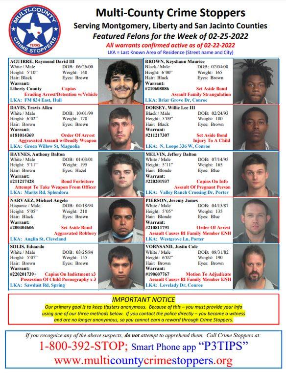 MONTGOMERY COUNTY, TX — Serving Montgomery, Liberty and San Jacinto Counties. Featured Felons for the Week of 2-25-2022. All warrants confirmed active as of 2-22-2022. If you recognize any of the above suspects, do not attempt to apprehend them. Call Crime Stoppers at:. 1-800-392-STOP; Smart Phone app “P3TIPS”. IMPORTANT…