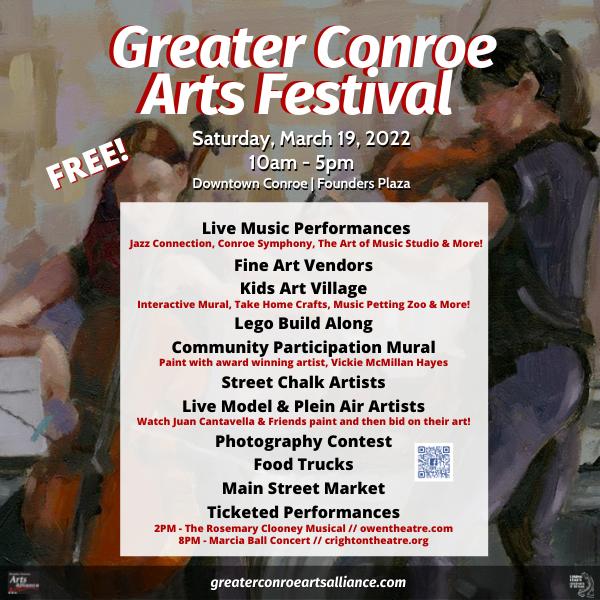 CONROE, TX – The annual Greater Conroe Arts Festival, featuring free, family-friendly art activities and events, will be held Saturday, March 19, 2022 from 10 a.m. to 5 p.m. in historic Downtown Conroe, with local and Texas artists representing all genres of the arts. The event is presented by the Greater Conroe Arts Alliance, made up of 18 arts organizations in Montgomery County which represent the performing and visual arts. The Festival events will be ongoing throughout the day.