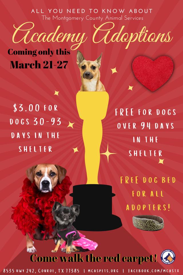 Montgomery County Animal Shelter Red Carpet Roll Out – March 21-27, 2022. MCAS is rolling out the red carpet for their star-studded line up of beautiful and talented dogs this week. There will be photo ops and adoption specials, so put on you best ball gown (or shorts and t-shirts),…