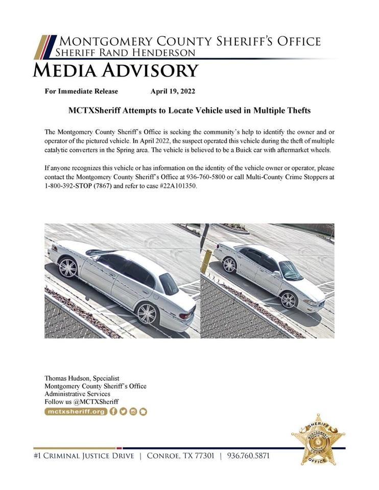 MCTXSheriff needs your assistance to identify a vehicle used in several catalytic converter thefts. The Montgomery County Sheriff’s Office is seeking the community’s help to identify the owner and or operator of the pictured vehicle. In April 2022, the suspect operated this vehicle during the theft of multiple catalytic converters in the Spring area. The vehicle is believed to be a Buick car with aftermarket wheels.