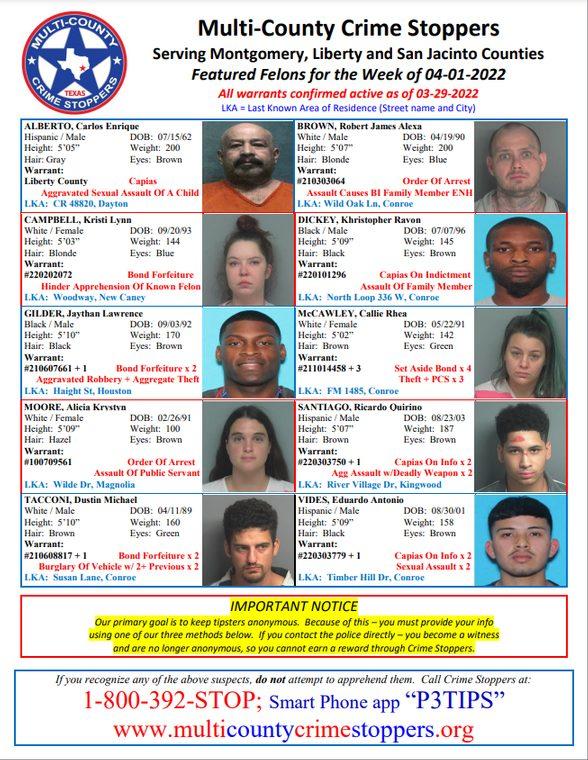 MONTGOMERY COUNTY, TX — Serving Montgomery, Liberty and San Jacinto Counties. Featured Felons for the Week of 4-01-2022. All warrants confirmed active as of 3-29-2022. If you recognize any of the above suspects, do not attempt to apprehend them. Call Crime Stoppers at:. 1-800-392-STOP; Smart Phone app “P3TIPS”. IMPORTANT…