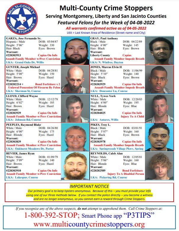 MONTGOMERY COUNTY, TX — Serving Montgomery, Liberty and San Jacinto Counties. Featured Felons for the Week of 4-08-2022. All warrants confirmed active as of 4-05-2022. If you recognize any of the above suspects, do not attempt to apprehend them. Call Crime Stoppers at:. 1-800-392-STOP; Smart Phone app “P3TIPS”. IMPORTANT…