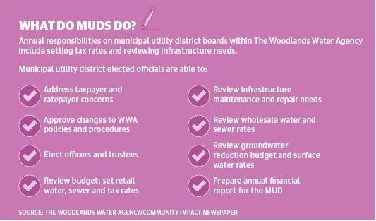 Interest in the boards governing nine municipal utility districts in The Woodlands resulted in 49 candidates seeking positions this year. The nonpartisan boards carry out functions such as setting retail and sewer rates as well as levying tax rates to finance infrastructure. Typically, tax rates in water districts become lower over time as they repay debt, according to the Texas Commission on Environmental Quality, which supervises water districts through the Texas Water Code.