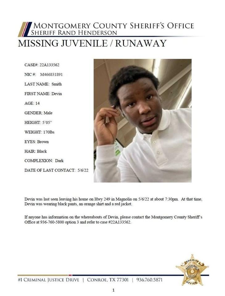 MCTXSheriff Searching for Missing Juvenile Devin Smith. MCTXSheriff Searching for Missing Juvenile Devin Smith. Devin was last seen leaving his home on Hwy 249 in Magnolia on 5/6/22 at about 7:30pm. At that time, Devin was wearing black pants, an orange shirt and a red jacket. If anyone has information…