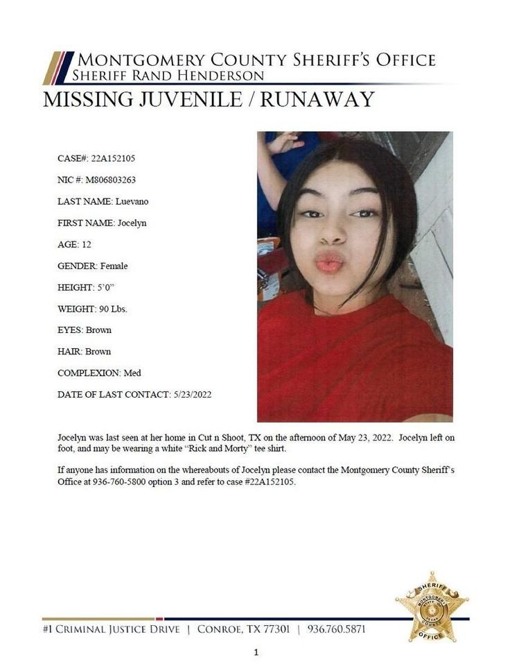 MCTXSheriff Searching For Missing Juvenile Jocelyn Luevano. MCTXSheriff Searching for Missing Juvenile Jocelyn Luevano. Jocelyn was last seen at her home in Cut n Shoot, TX on the afternoon of May 23, 2022. Jocelyn left on foot, and may be wearing a white “Rick and Morty” tee shirt.