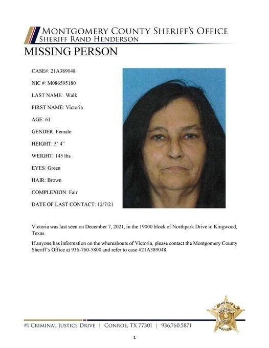 Montgomery County Sheriff is searching for missing person Victoria Walk. Victoria was last seen on 12/7/21 in the 1900 block of Northpark Drive in Kingwood, Texas. If anyone has information on the whereabouts of Victoria, please contact the Montgomery County Sheriff’s Office at 936-760-5800 and refer to case #21A389048.