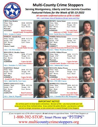 MONTGOMERY COUNTY, TX — Serving Montgomery, Liberty and San Jacinto Counties. Featured Felons for the Week of 5-13-2022. All warrants confirmed active as of 5-11-2022. If you recognize any of the above suspects, do not attempt to apprehend them. Call Crime Stoppers at:. 1-800-392-STOP; Smart Phone app “P3TIPS”. IMPORTANT…