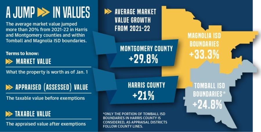 Property owners in Tomball and Magnolia may have seen a sharp jump in their home’s market value on appraisal notices mailed out this spring. From 2021-22, the average market value of properties increased 21% and 29.8%, respectively, in Harris and Montgomery counties, according to data from the counties. In comparison, the average market value for properties has risen no more than 15.4% year over year within Harris County and no more than 11.2% in Montgomery County in the years prior since 2010.