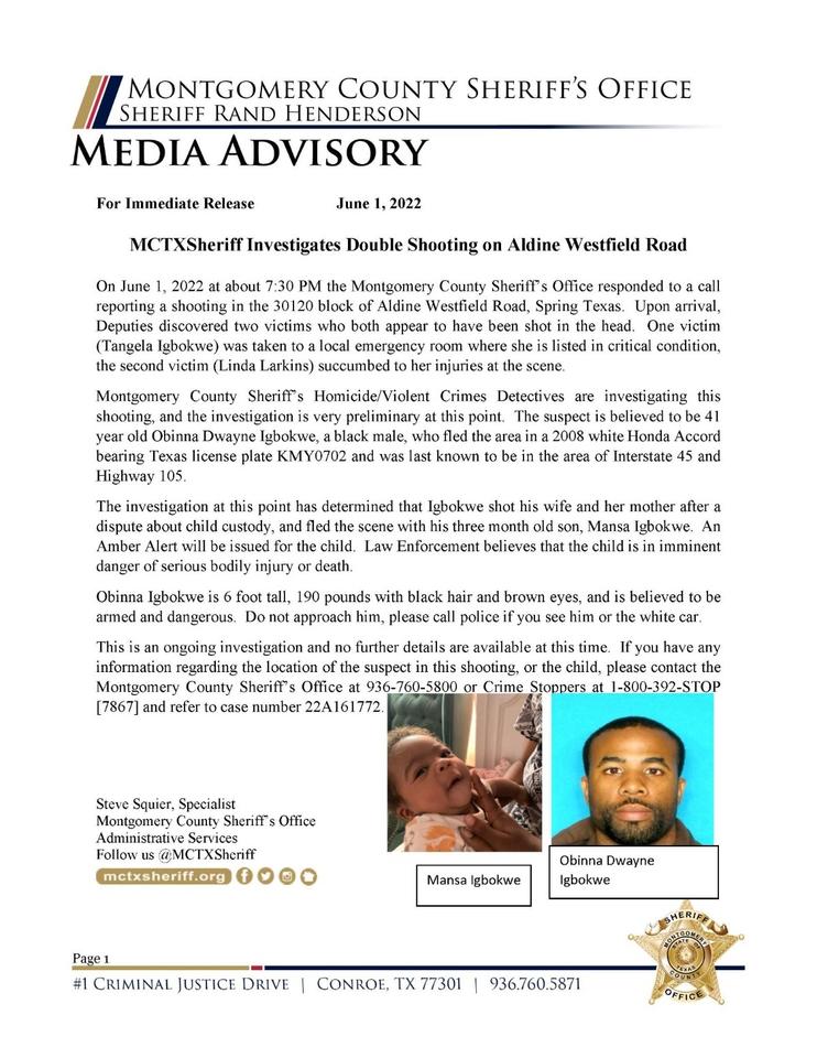 Child Taken in Homicide Found Safe. On June 2, 2022, at about 12:00 am Detectives with the Montgomery County Sheriff’s Office were contacted by the Corsicana Police Department and advised they had Mansa Igbokwe in their care. According to the Corsicana Police Department, a male dropped off the child…