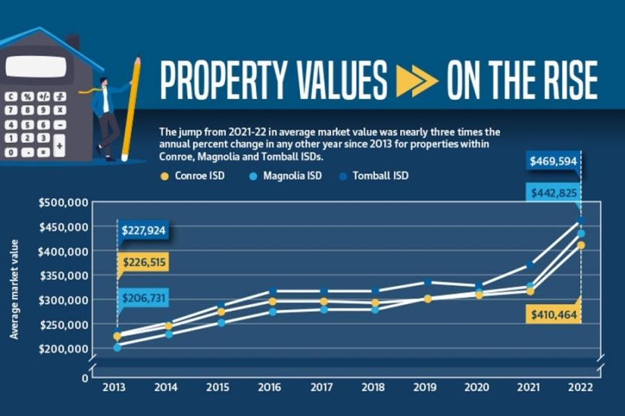 Property owners in The Woodlands area may have seen a sharp jump in their home’s market value on appraisal notices mailed out this spring. From 2021-22, the average market value of properties increased 29.8% and 21%, respectively, in Montgomery and Harris counties, according to data from the county appraisal districts. In comparison, the average market value for properties rose no more than 11.2% year over year in Montgomery County and 15.4% within Harris County in the years prior since 2010.
