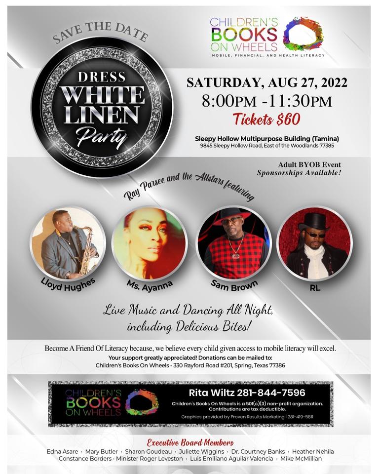 CONROE, TX – It is time for the Annual Dress White Linen Fundraising Party hosted by Children’s Books on Wheels (CBOW). CBOW hopes the public attends the Dress White Linen Party event to help fund mobile literacy services throughout the county. Students that have access to books for reading perform better on reading and writing tests than non-reading students with increased opportunity for success in their life.