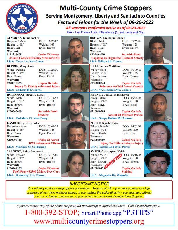 MONTGOMERY COUNTY, TX — Serving Montgomery, Liberty and San Jacinto Counties. Featured Felons for the Week of 8-26-2022. All warrants confirmed active as of 08-23-2022. If you recognize any of the above suspects, do not attempt to apprehend them. Call Crime Stoppers at:. 1-800-392-STOP; Smart Phone app “P3TIPS”. IMPORTANT…