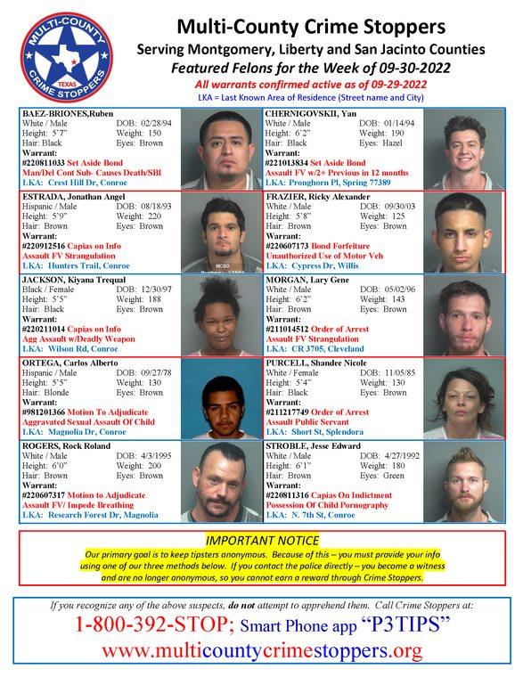 MONTGOMERY COUNTY, TX — Serving Montgomery, Liberty and San Jacinto Counties. Featured Felons for the Week of 9-30-2022. All warrants confirmed active as of 9-29-2022. If you recognize any of the above suspects, do not attempt to apprehend them. Call Crime Stoppers at:. 1-800-392-STOP; Smart Phone app “P3TIPS”. IMPORTANT…