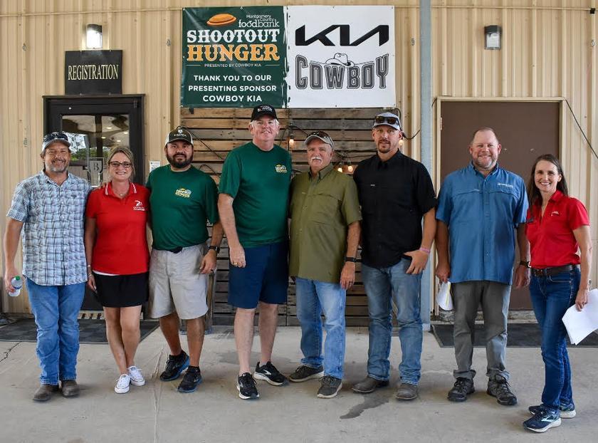 2022 Shootout Hunger Committee: Dan Roberts – B&L Pipe Co., Cheri Huber – Greater East Montgomery County Chamber, Rick Botello – Enterprise Holdings, George Waggoner – First National Bank Texas, Wayne Cox – B&L Pipe Co., and Heath Konesheck – B&L Pipe Co. pose with Kelly Holmes – MCFB Chairman of the Board and Kristine Marlow – MCFB President & CEO.