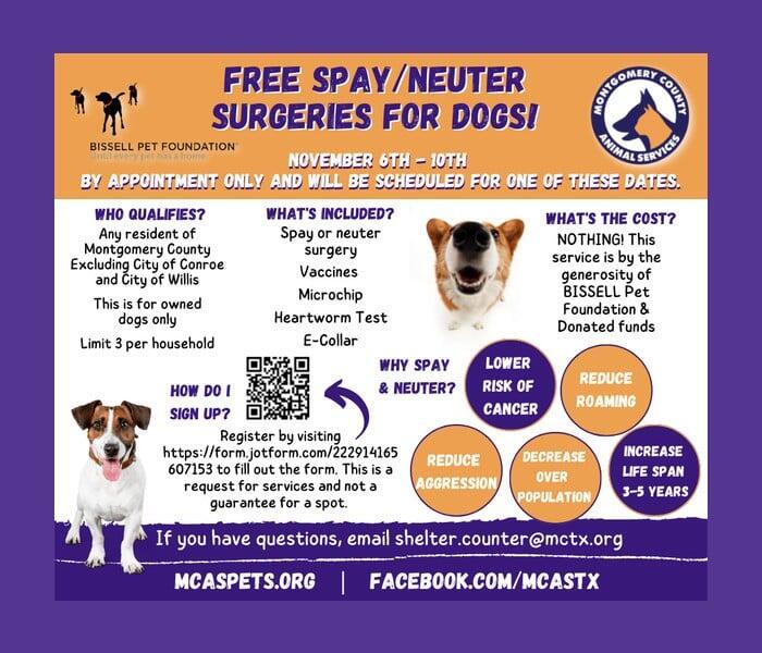 Montgomery County Animal Shelter Partners with Bissell to Offer Free Spay/Neuter Clinic. MCAS has partnered with BISSELL Pet Foundation to host and fund a five-day free public spay/neuter clinic for dogs from Sunday November 6th through Thursday November 10th. The clinic is being held to help alleviate shelter overcrowding by preventing unwanted litters. Dogs spayed and neutered at the event will also receive free of charge age-appropriate vaccinations, including rabies, a microchip, a heartworm test and an e-collar.