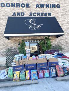 CONROE, TX — Chrissie and Luis Teste, owners of Conroe Awning and Screen are animal lovers, rescuing several cats and dogs! Realizing that there is an abundance of animals being housed in our local shelters, Chrissie enlisted the help of some friends and the community to collect pet food, blankets, towels, and bedding for the animals. Donations have been coming in, with Montogomery residents even sending boxes of Chewy.com to the collection site.