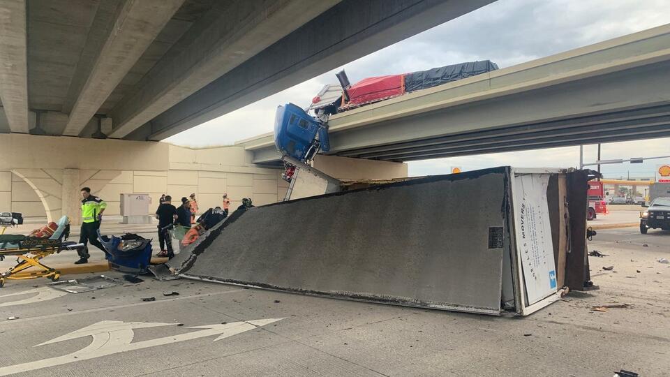 An 18-wheeler crash in Montgomery County is expected to cause very heavy delays on Monday morning. The crash occurred on the Grand Parkway near Birnham Woods Drive. It’s not clear what led up to the crash, but one 18-wheeler was left hanging off of the overpass. Another 18-wheeler is flipped over on its side under the overpass.
