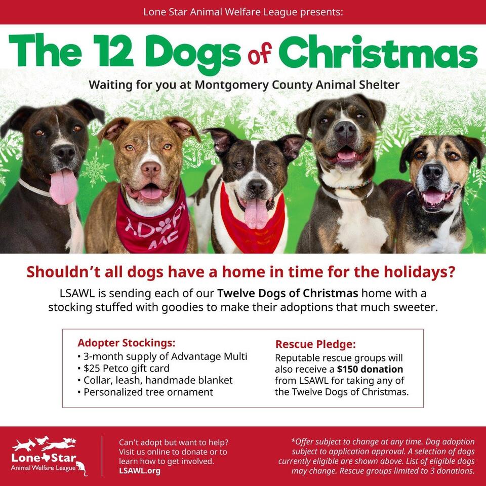 12 Days of Dogs at Montgomery County Animal Shelter. Without further delay, let’s kick off our very special partnership with Lone Star Animal Welfare League: Introducing the Twelve Dogs of Christmas! Our Twelve Dogs of Christmas have been patiently waiting for homes for far too long. LSAWL believes all dogs should have a home in time for the holidays. To help a few dogs who have been waiting the longest, LSAWL is sending each home with a stocking stuffed with goodies to make their adoptions that much sweeter. This includes a 3-month supply of Advantage Multi, a $25 Petco gift card, a handmade blanket, a collar and leash, and a personalized ornament to adorn their new family’s tree. If any of these select dogs are pulled by a reputable rescue before they are adopted, LSAWL will add a $150 donation, up to three dogs per rescue. Please consider giving one of these wonderful pups a home. They are all volunteer favorites as you can tell by the many photos and comments left by their adoring fans. Click the links below to read through the comments and then come meet them for yourself. Stay tuned as we showcase one dog each day. Pictured here are dogs, from left to right: Krissy, Hilo, Elliot, Serena and Keyton.