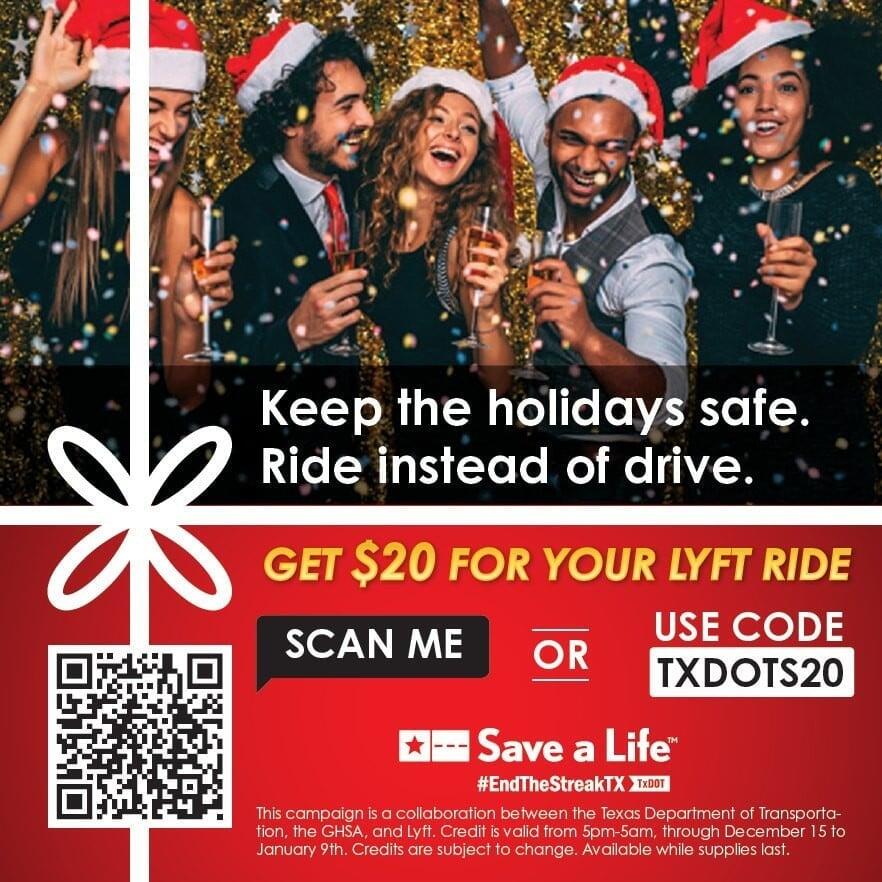 TxDOT and Lyft Parter to Offer $20 Lyft Credits to Harris and Montgomery County Residents. TxDOT and Lyft have partnered to launch the “Keep the holidays safe this year by riding, not driving, when drinking this season.” TxDOT is giving out $20 Lyft credits to Harris and Montgomery county citizens.