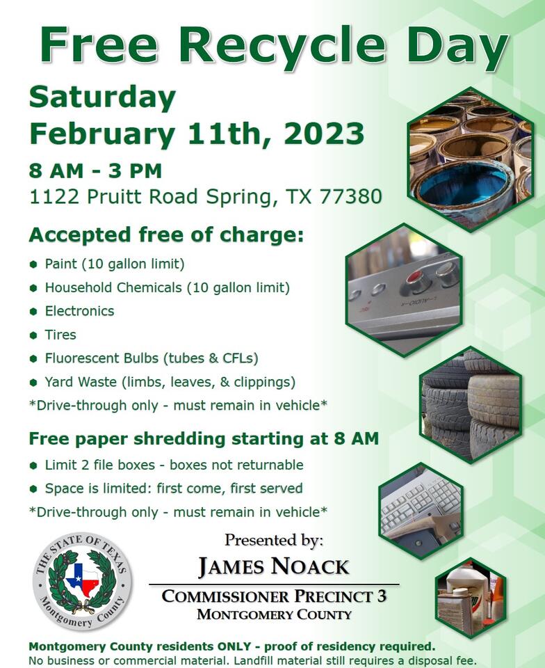MONTGOMERY COUNTY, TX – Free Recycle Day returns to Montgomery County Precinct 3 Commissioner James Noack’s facility in February. Precinct 3 crews will be accepting various items free of charge between 8 a.m. and 3 p.m. Saturday, Feb. 11, 2023, at the Recycling Center, located at 1122 Pruitt Road in Spring, as well as other stations set up at adjacent parking lots by the sports fields. Drive-through/Drop-off only – Residents must remain in vehicle.