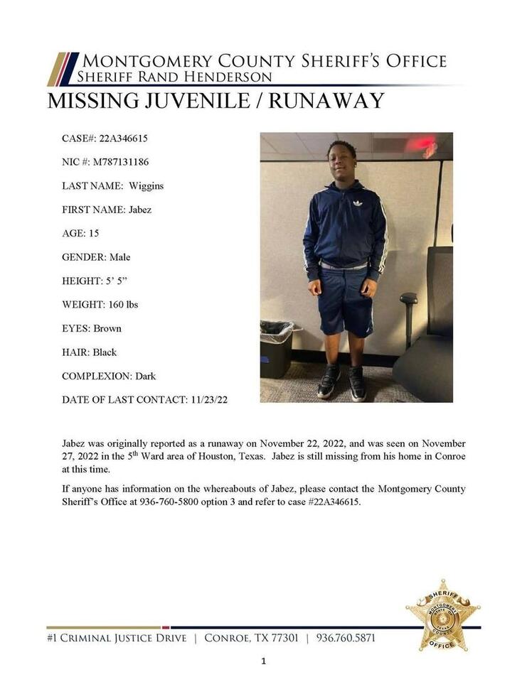 MCTXSheriff Searching for Missing Juvenile Jabez Wiggins. Jabez was originally reported as a runaway on November 22, 2022, and was seen on November 27, 2022 in the 5th Ward area of Houston, Texas. Jabez is still missing from his home in Conroe at this time. If anyone has information on…