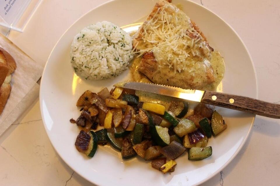 The Pesto Chicken ($12.95) is served with mixed vegetables and a side of rice. (Peyton MacKenzie/Community Impact) Mike Kelton owns and operates four eateries, and he opened his newest venture—Hunger Crush Cafe—in June in Montgomery, which partners with the Montgomery County Food Bank to feed families in need.