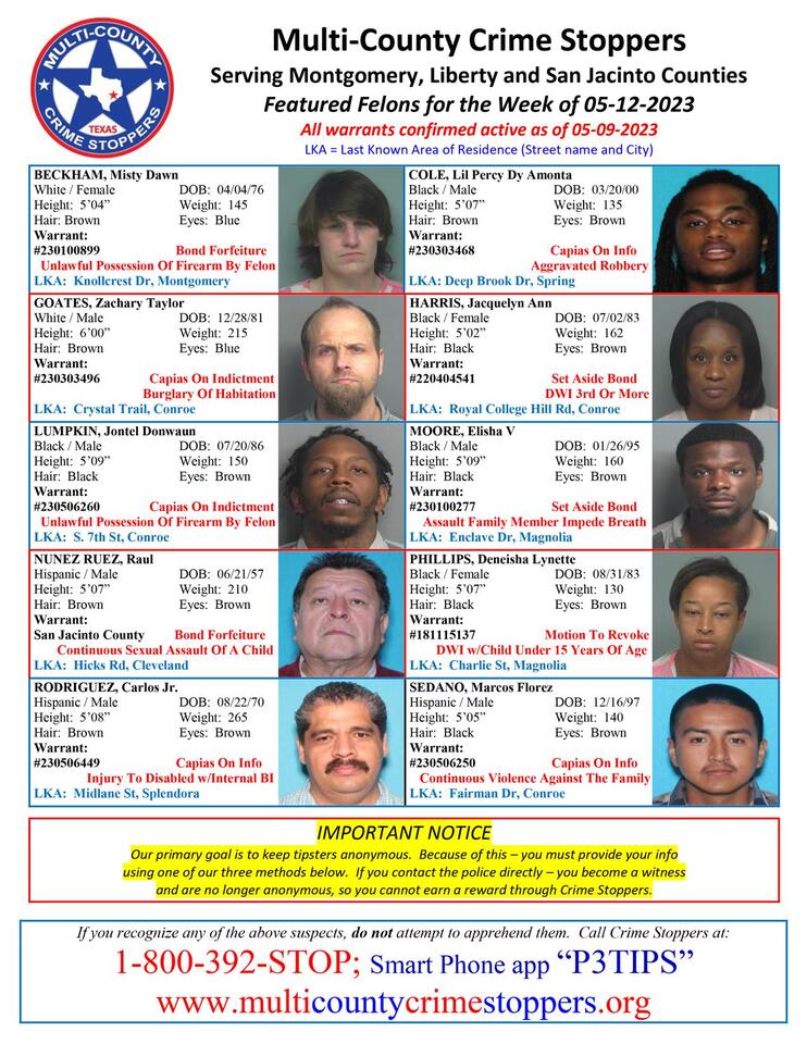 The persons in the attached photo were named as this week’s Featured Felons by the Multi-County Crime Stoppers organization, which serves Montgomery, Liberty and San Jacinto counties. All persons had active warrants as of May 12, 2023. If you see one of the persons pictured, do not attempt to…