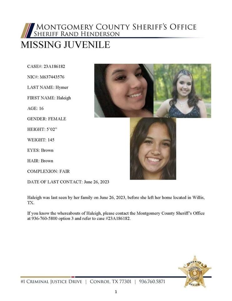 Haleigh was last seen by her family on June 26, 2023, before she left her home located in Willis, TX. If you know the whereabouts of Haleigh, please contact the Montgomery County Sheriff’s Office at 936-760-5800 option 3 and refer to case #23A186182.