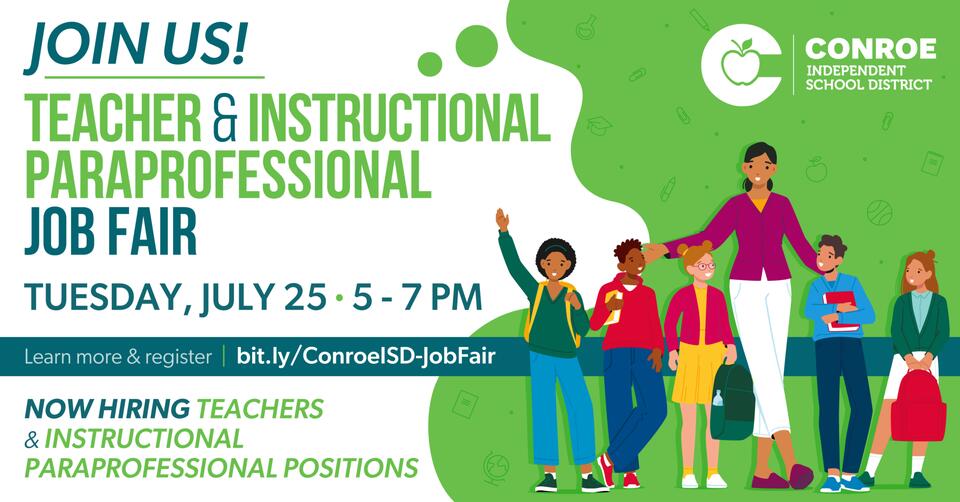 CONROE, TX – Conroe ISD will hold a Job Fair for teachers and instructional paraprofessionals Tuesday, July 25, 2023, from 5-7 p.m. at the Walter P. Jett Teacher Training Center. Applicants may register at: http://tiny.conroeisd.net/FCdJA. The Jett Center is located at 19043 David Memorial Drive, Shenandoah, TX 77385. Conroe…