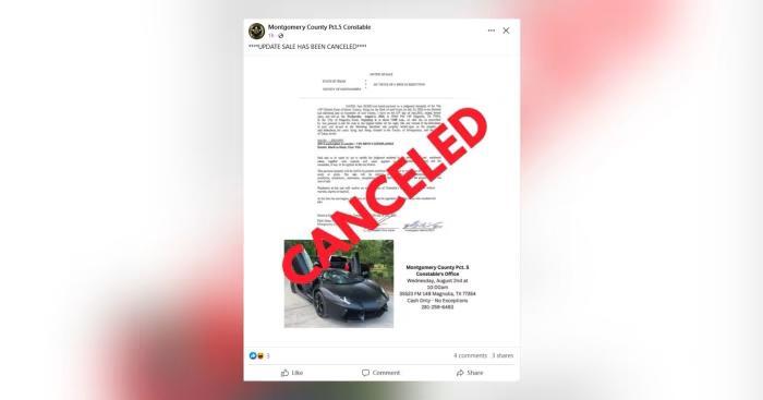 Original Article: https://www.click2houston.com/news/local/2023/08/01/lambo-is-a-no-go-montgomery-county-pct-5-pulls-plug-on-auction-for-seized-black-on-black-lamborghini/