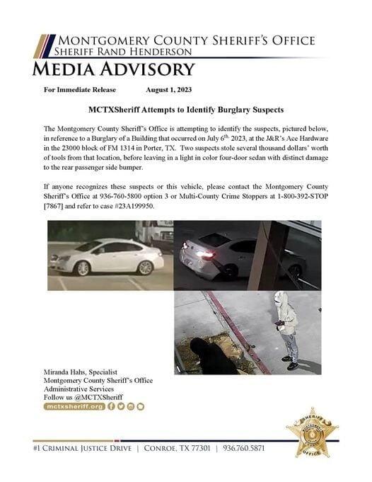 Montgomery County Sheriff’s Office seeks help identifying burglary suspects. MCTXSheriff Attempts to Identify Burglary Suspects. The Montgomery County Sheriff’s Office is attempting to identify the suspects, pictured below, in reference to a Burglary of a Building that occurred on July 6th, 2023, at the J&R’s Ace Hardware in the 23000 block of FM 1314 in Porter, TX. Two suspects stole several thousand dollars’ worth of tools from that location, before leaving in a light in color four-door sedan with distinct damage to the rear passenger side bumper.