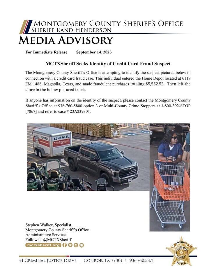 Law Enforcement Agencies Seek Public’s Help in Fraud Investigation. MCTXSheriff Seeks Identity of Credit Card Fraud Suspect. The Montgomery County Sheriff’s Office is attempting to identify the suspect pictured below in connection with a credit card fraud case. This individual entered the Home Depot located at 6119 FM 1488,…