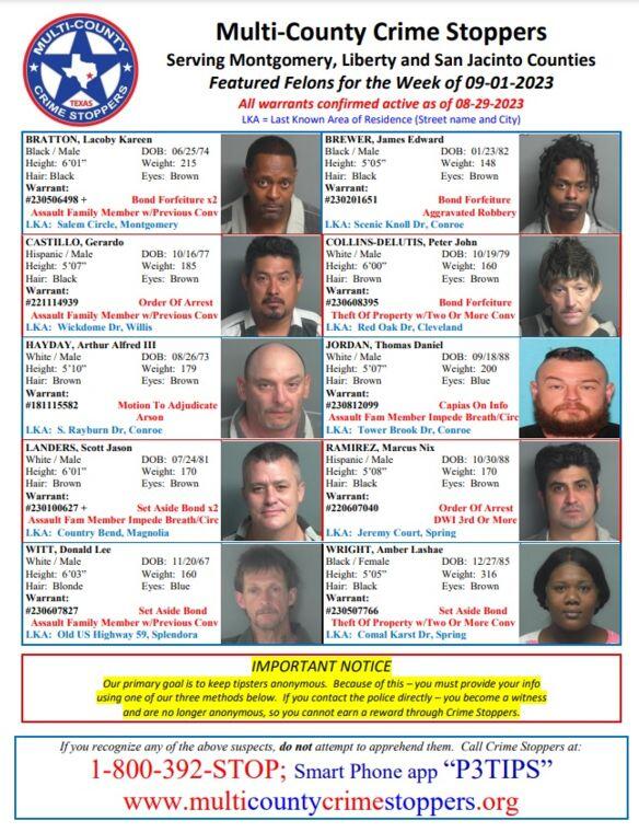 MONTGOMERY COUNTY, TX — Serving Montgomery, Liberty and San Jacinto Counties. Featured Felons for the Week of 09-01-2023. All warrants confirmed active as of 08-29-2023. If you recognize any of the above suspects, do not attempt to apprehend them. Call Crime Stoppers at:. 1-800-392-STOP; Smart Phone app “P3TIPS”. IMPORTANT…